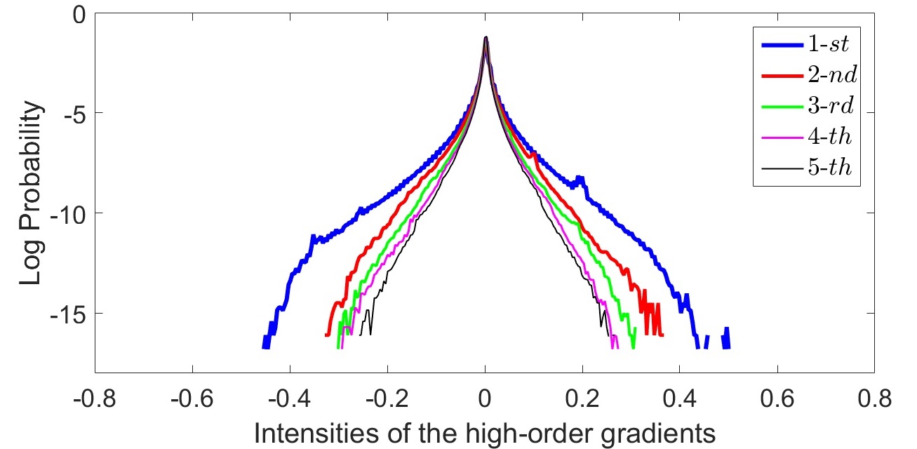This result can be also explained from the higher-order gradient distributions of natural images in Fig. 2, where the sparseness of the higher-order gradient signal is gradually enhanced when the order \(n\) increases. Moreover, there exists a bound of the spareness when the order \(n\) keeps increasing, as the distributions tend to be more and more similar. On the other hand, it is also clear that the gap of sparseness of the \(1^{st}\) and \(2^{nd}\) order gradients is much bigger than that of the \(2^{nd}\) and \(3^{rd}\) order gradients. A similar trend is also observed in the higher-order cases. Accordingly, we claim that the polynomial-smoothing surfaces with degree (\(n \geq 3\)) do not frequently occur in natural images, the area of which is relatively smaller than that of the \(n=2\) case. Therefore, it is usually enough to impose sparse regularization on second-order gradients for natural images. Another consideration of choosing the \(2^{nd}\) order gradient for regularization is to reduce the computation cost in many practical applications.