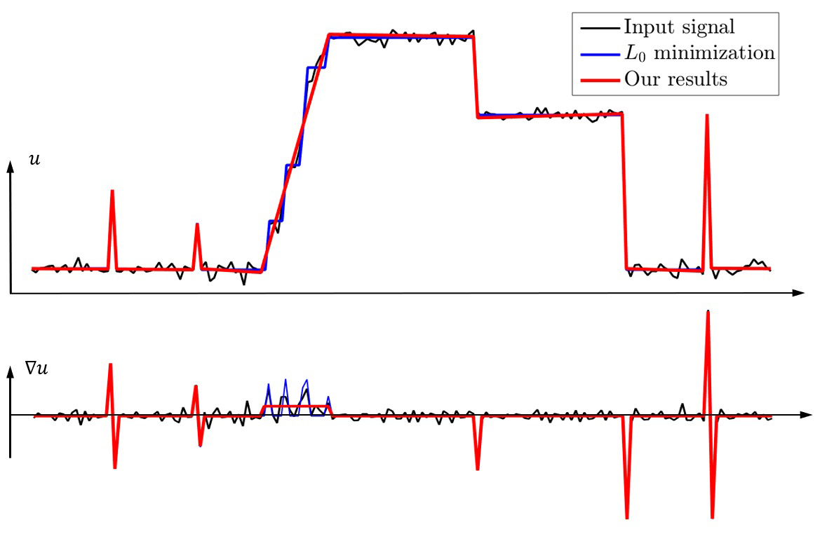 \[\begin{equation} \begin{aligned} \mathop{\min}_{u} \mathcal{F}(u) + \lambda {\left\Vert Hu \right\Vert }_0 \end{aligned} \label{eq:7} \end{equation}\]where \(\mathcal{F}\) is a proper convex function, \(H\) is a (differential) operator and the \(L_0\)-norm regularized term is a non-convex, non-smoothing but a certain separable function.